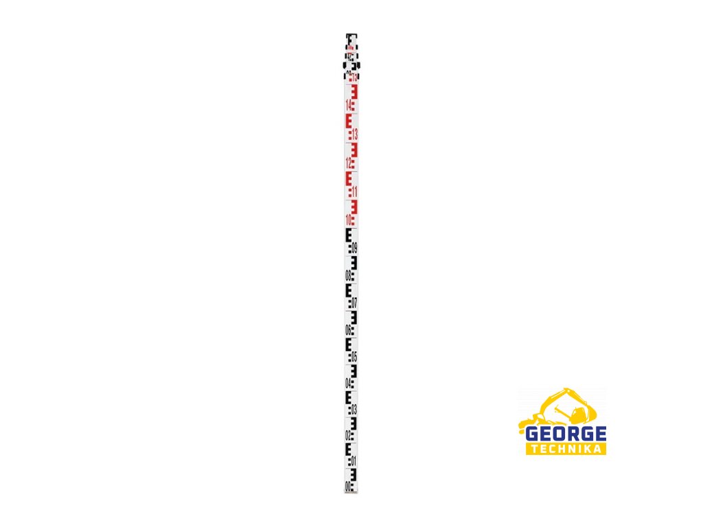 Značení typu E je dokonale viditelné z velké vzdálenosti, zatímco druhá strana tyče je vybavena číselnou stupnicí pro práci s laserovou vodováhou.